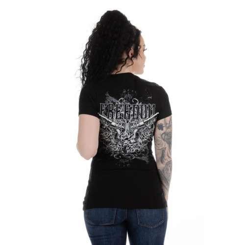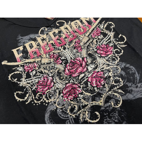 Questo top Liberty Wear è caratterizzato da un design unico con pistole, la scritta 'Freedom' e dettagli di rose e strass sul davanti. Realizzato con cura negli Stati Uniti con il 95% di rayon e il 5% di spandex. Scopri uno stile autentico e confortevole che celebra la libertà. Acquista ora e indossa con orgoglio.