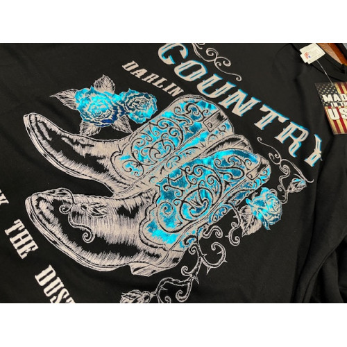 Top Liberty Wear con grafica Country Darlin' «kick the dust up» e stivali impreziositi da una lamina blu, retro liscio. Realizzato con cura negli Stati Uniti.
